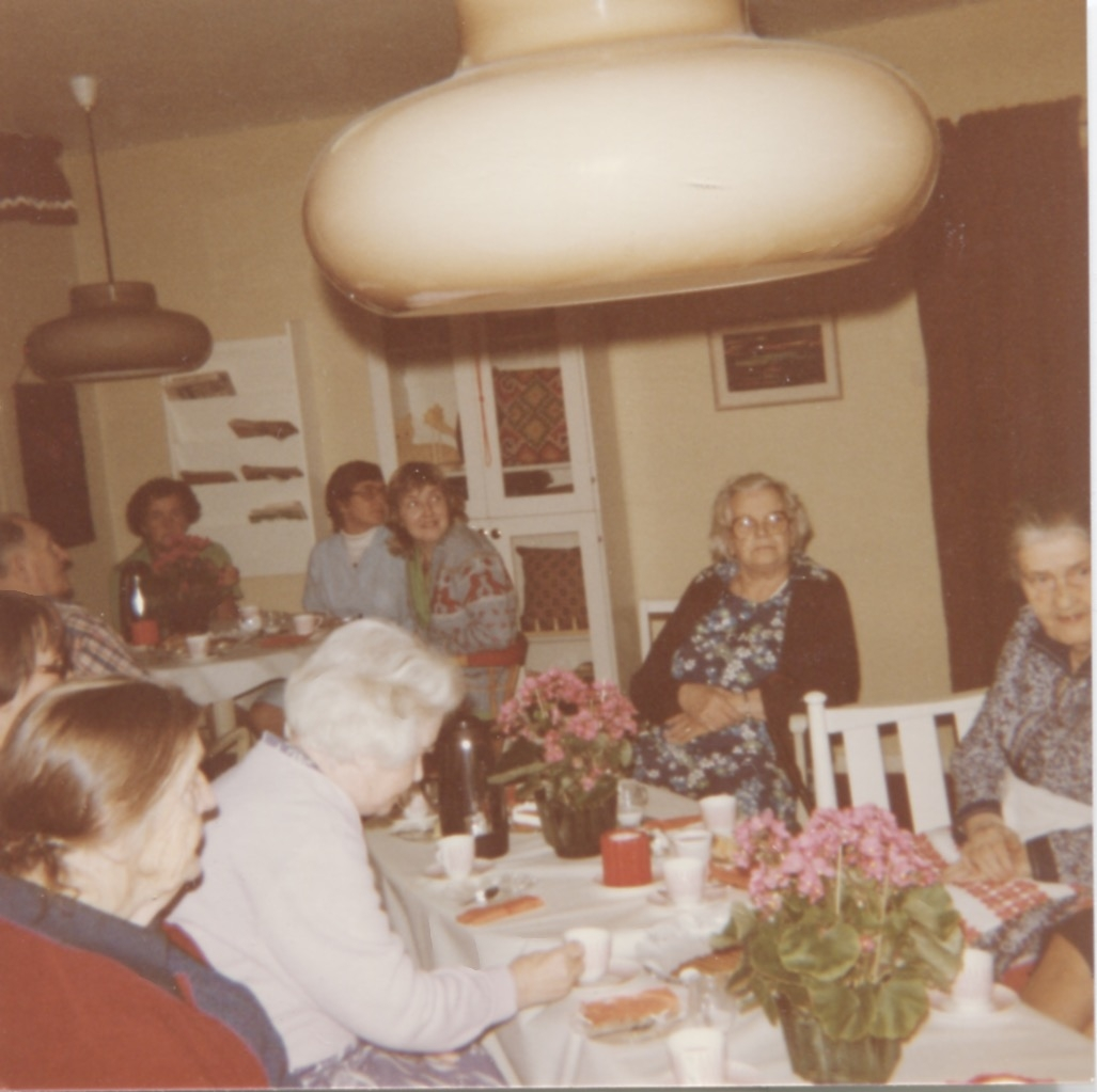 Personal och boende sitter och fikar i Brattåshemmets terapirum på nedre våningen, 1970-tal. Namnuppgifter saknas. I blå rock sitter en kvinnlig personal.