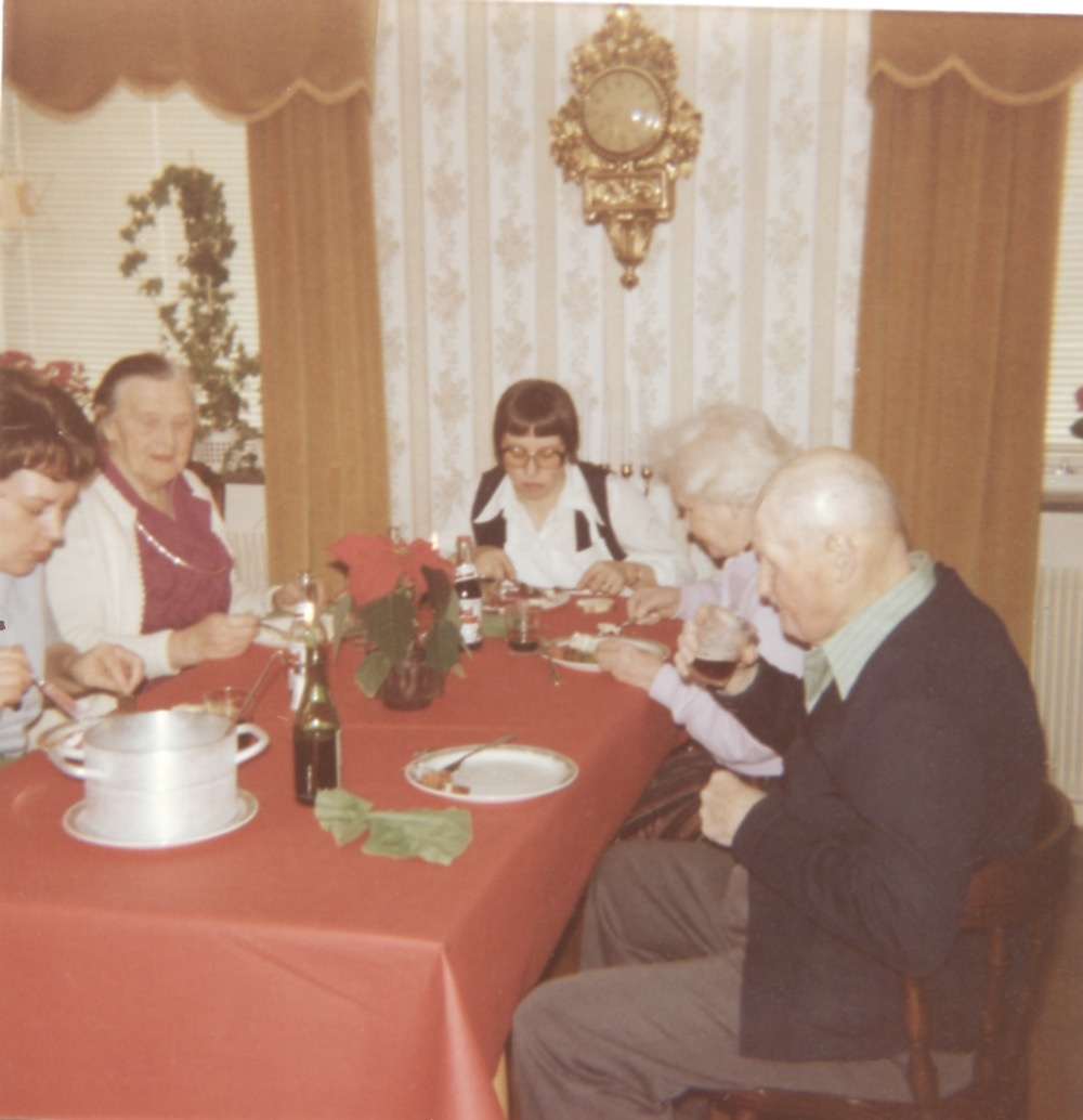Fem personer sitter och äter på Brattåshemmet 1970-tal. Från vänster: 1. Okänd kvinna. 2. Okänd kvinna. 3. Okänd kvinna (personal?). 4. Ellen Hansson. 5. Alfred Mattsson.