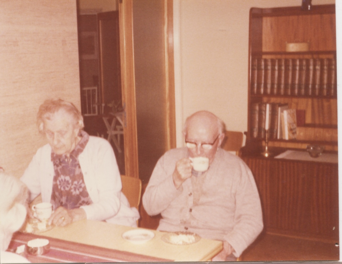 Fikastund i Brattåshemmets matsal 1970-tal. Från vänster: okänd kvinna samt Knut Hagberg (1885 - 1980).