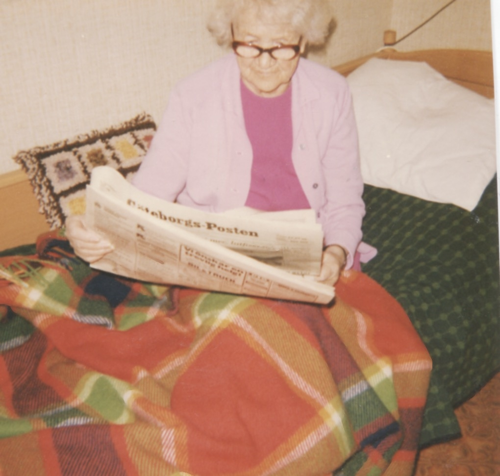 En okänd kvinna (boende?) sitter på en säng och läser Göteborgs-Posten, Brattåshemmet 1970 - 80-tal. Kvinnan har en filt över benen. I bakgrunden ses ett par kuddar.