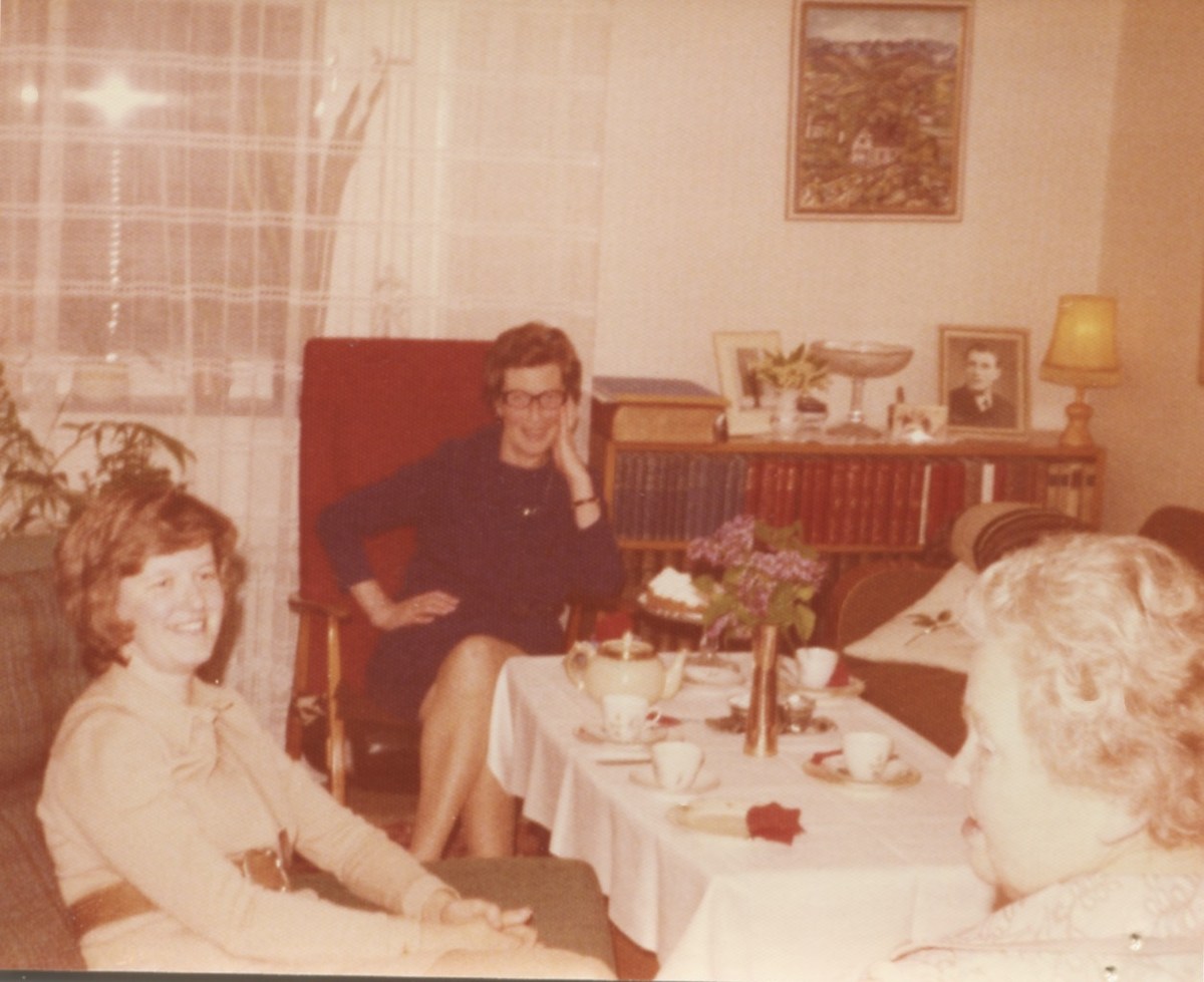 Tre kvinnor sitter runt ett bord i Brattåshemmets personallägenhet 1970-tal. Från vänster: 1. Föreståndare. 2. Inga Svanberg, biträde. 3. Okänd kokerska?