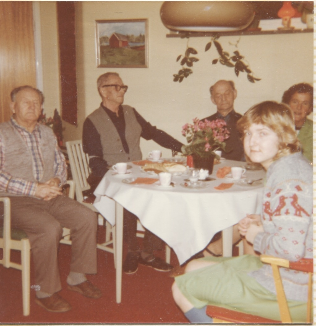 Fikastund för boende och personal, Brattåshemmet 1970-tal. Från vänster: 1. Okänd man. 2. Per Pettersson. 3. Anselm Zackrisson. 4. Maj-Britt Reimertz, vårdbiträde. 5. Okänd kvinna.