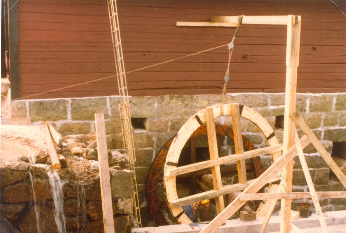 Vattenhjul vid Stensfors kvarn under restaureringen 1976-1977.