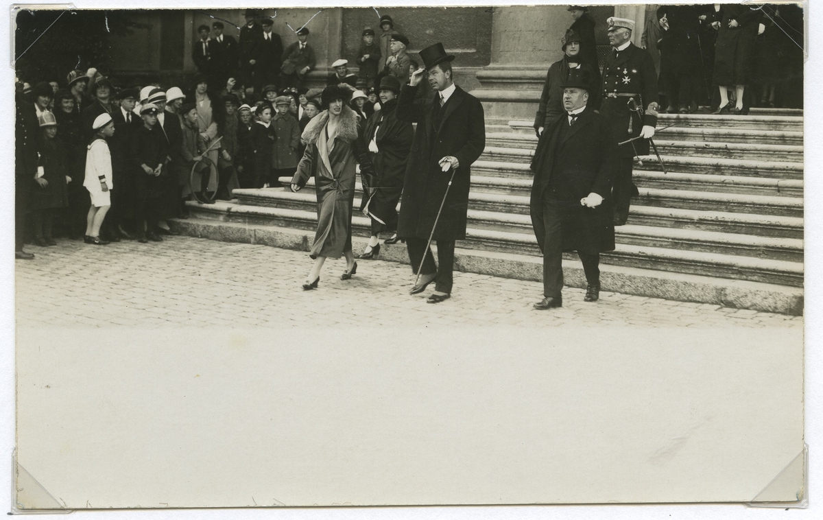 Gustaf (VI) Adolf och Louise Mountbatten som kronprinspar på väg ut från Trefaldighetskyrkan i Karlskrona.