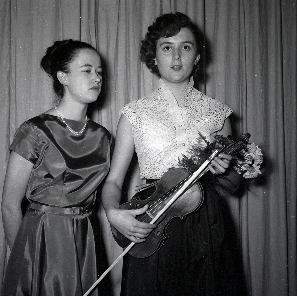 Titel: Bild tagen i samband med att flyktingar ifrån Ungern kom 1956. Två kvinnor som står på scen. Den ena kvinnan håller i ett stråkinstrument i Godtemplargården hösten 56 - våren 57.