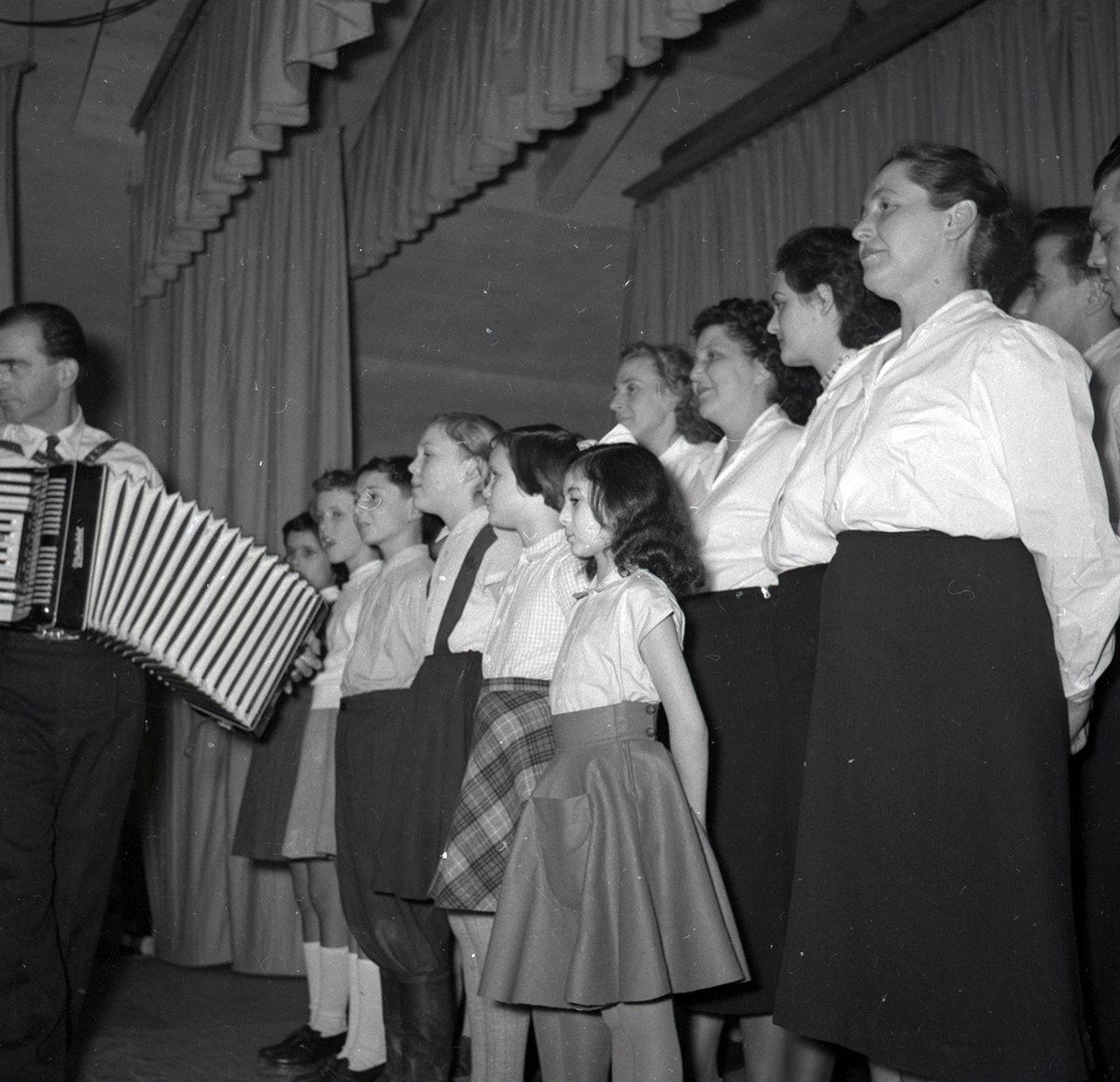 Bild tagen i samband med flyktingar ifrån Ungern 1956. Folk som står på scen och en man som spelar dragspel, förmodligen i Godtemplargården. Hösten 56 - våren 57.