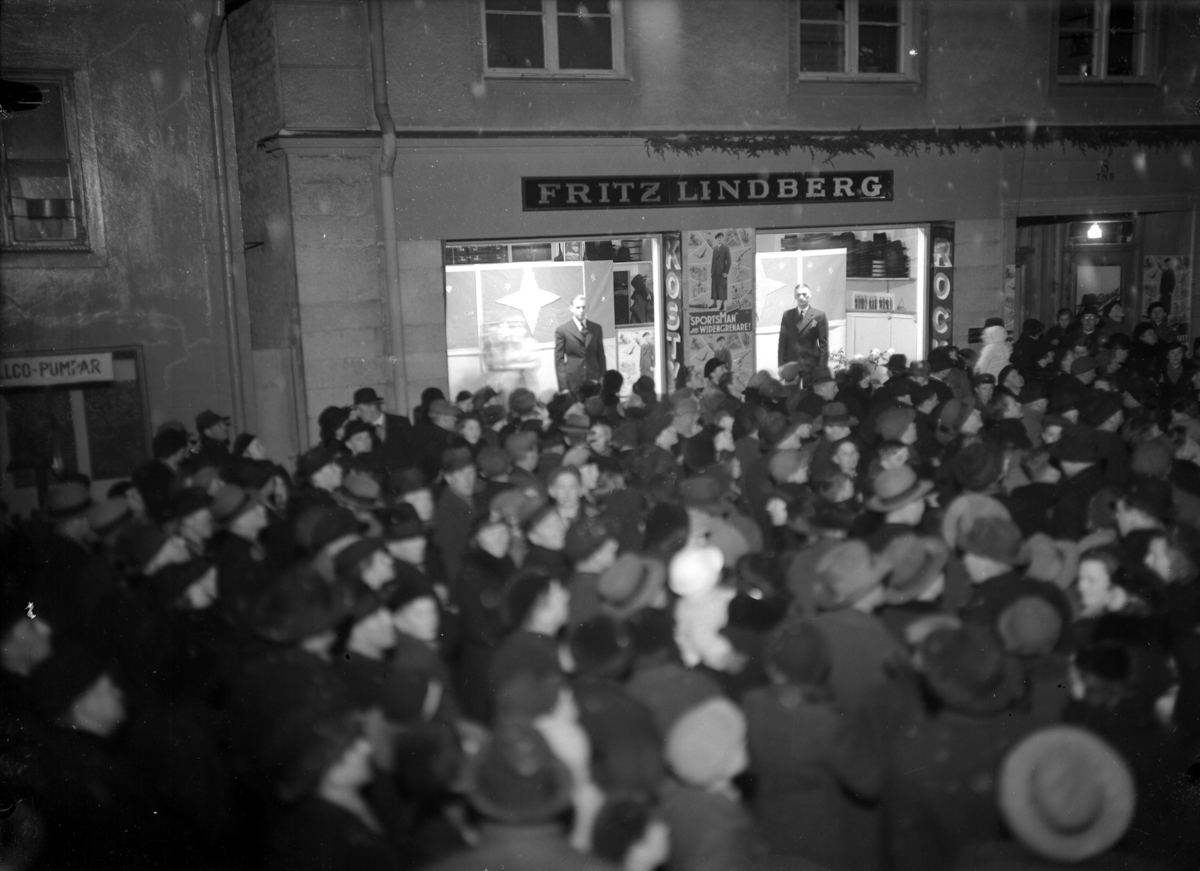 En folksamling utanför en herrekipering. Bilden är beställd av Fritz Lindberg.