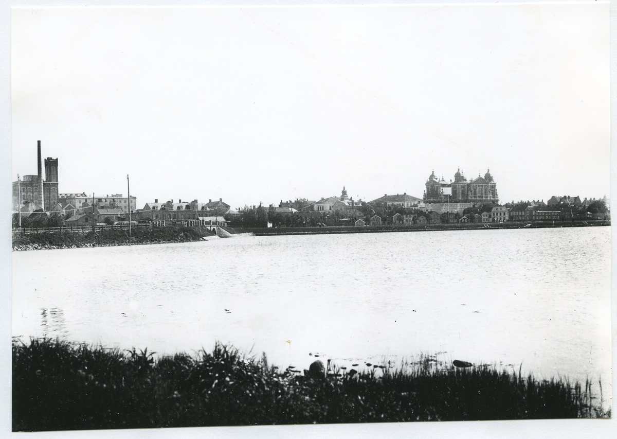 Vy mot Kalmar från Ängö. Domkyrkan och Ångkvarnen i bakgrunden.