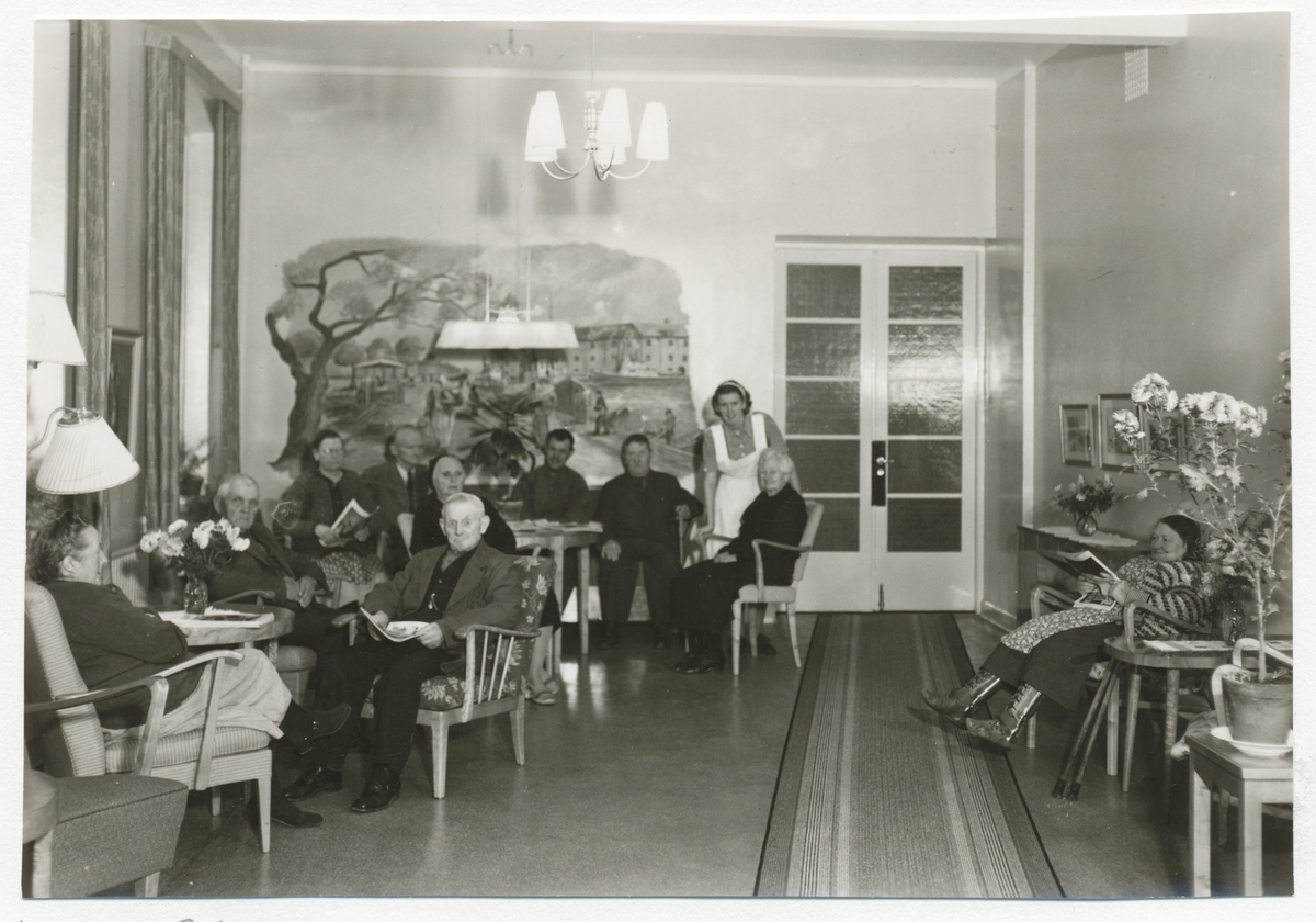 Ålderdomshemmet Falkenbergshuset, pensionärer och personal i dagrummet.