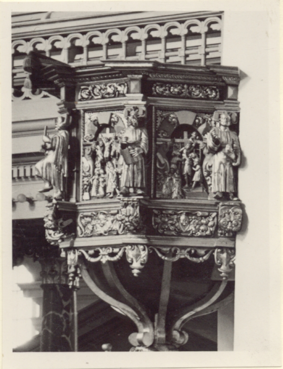 Predikstolen i barock med baldakin överförd från den tidigare kyrkan, är troligen ett krigsbyte, som antas vara skulpterad i mitten av 1600-talet.