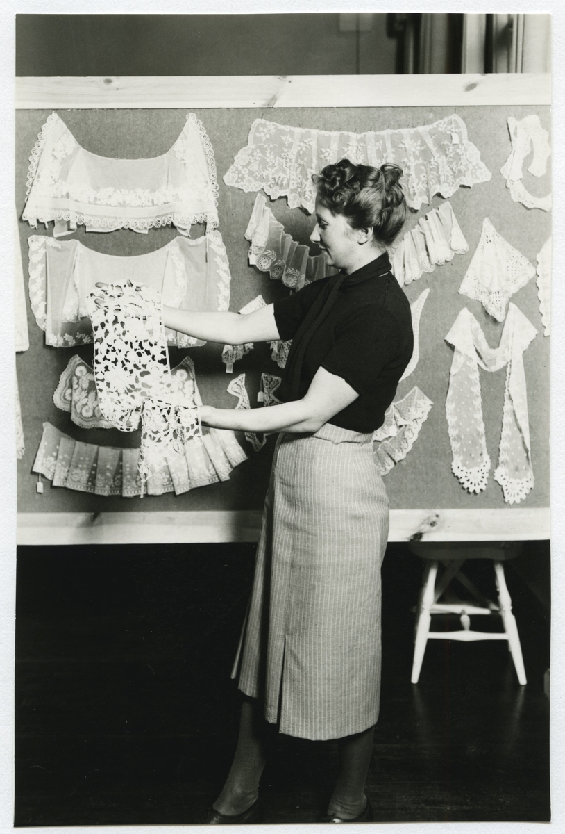 En kvinna som tittar på olika arbeten med spetsar, uppsatta på en skärm.