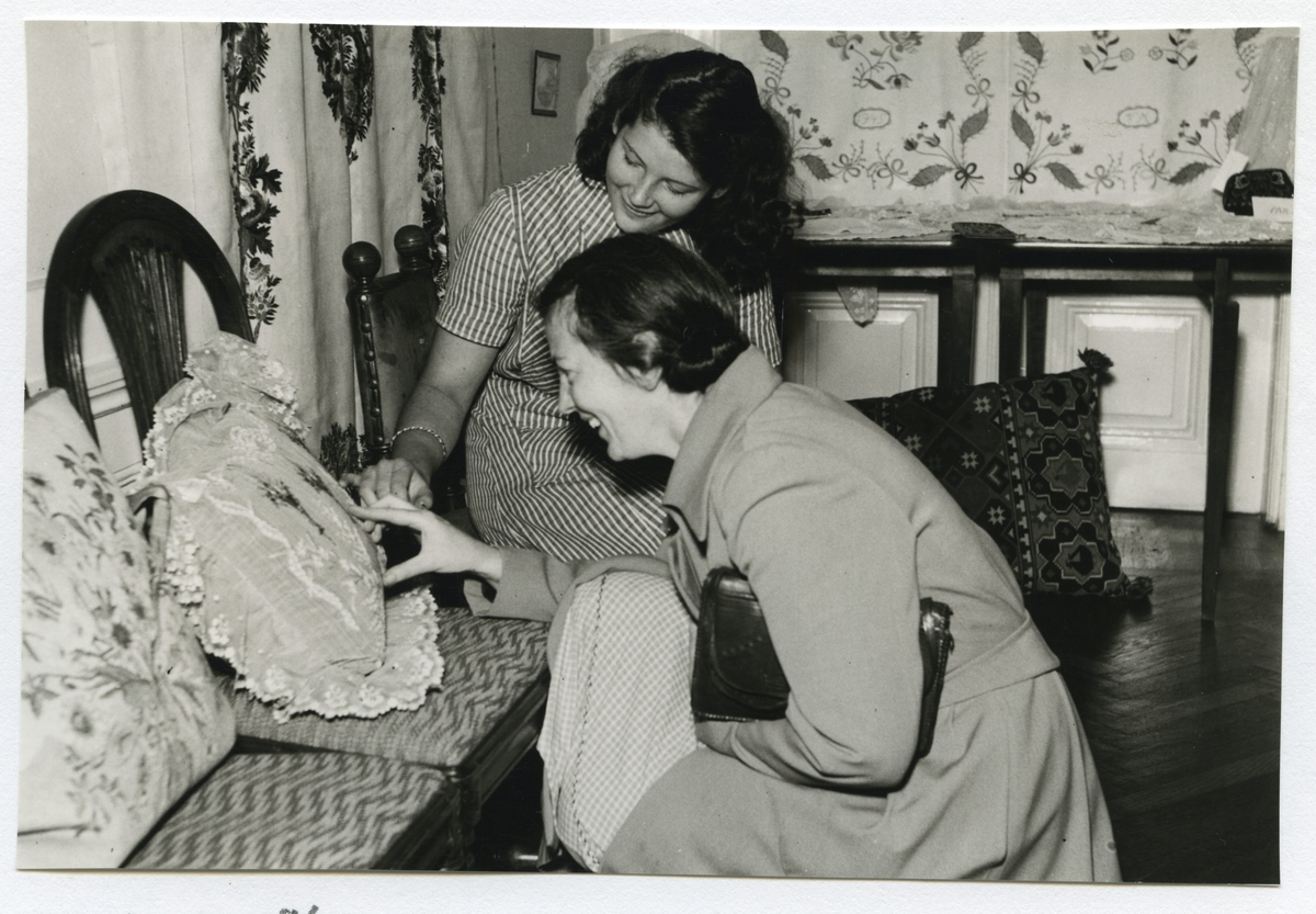 Två kvinnor studerar en broderad kudde som är placerad på en stol.