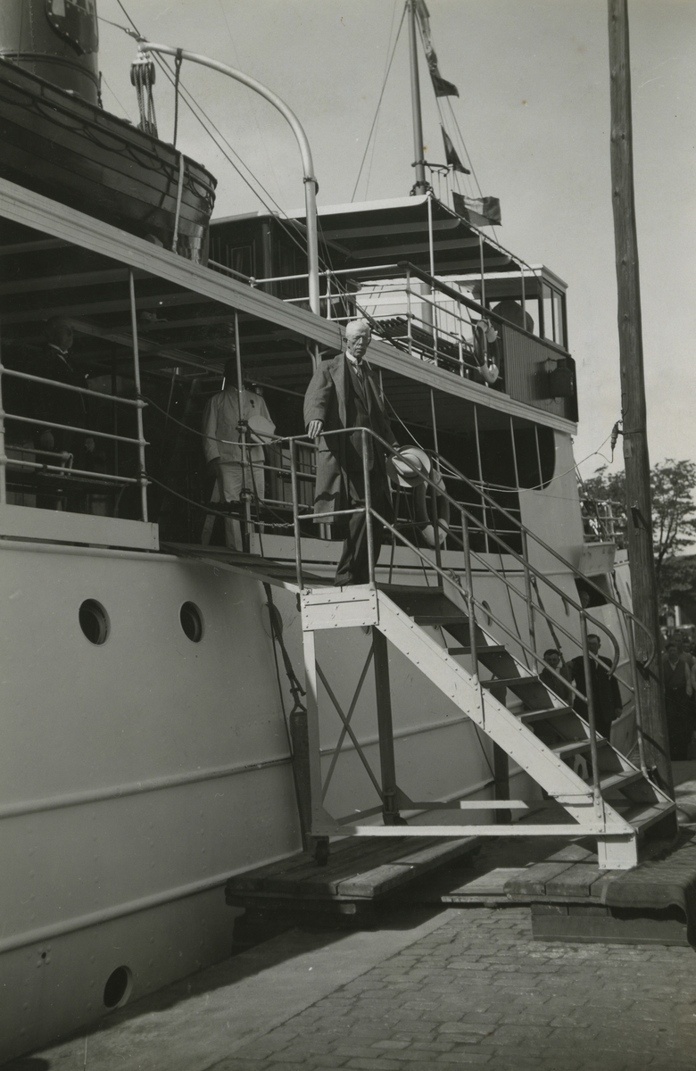 Kung Gustav V går av färjan i ölandshamnen.