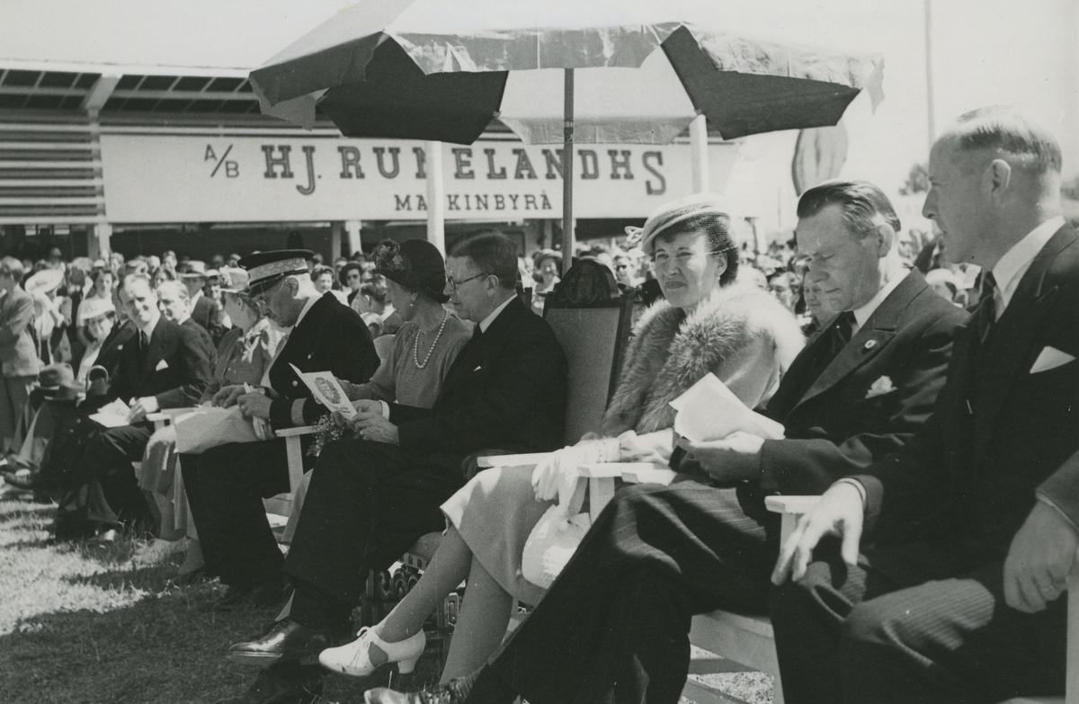 På fotots baksida: Invigning av hantverksutställningen 1947 i Kalmar. Invigde utställningen gjorde kronprins Gustaf Adolf, blivande kung Gustaf VI Adolf
