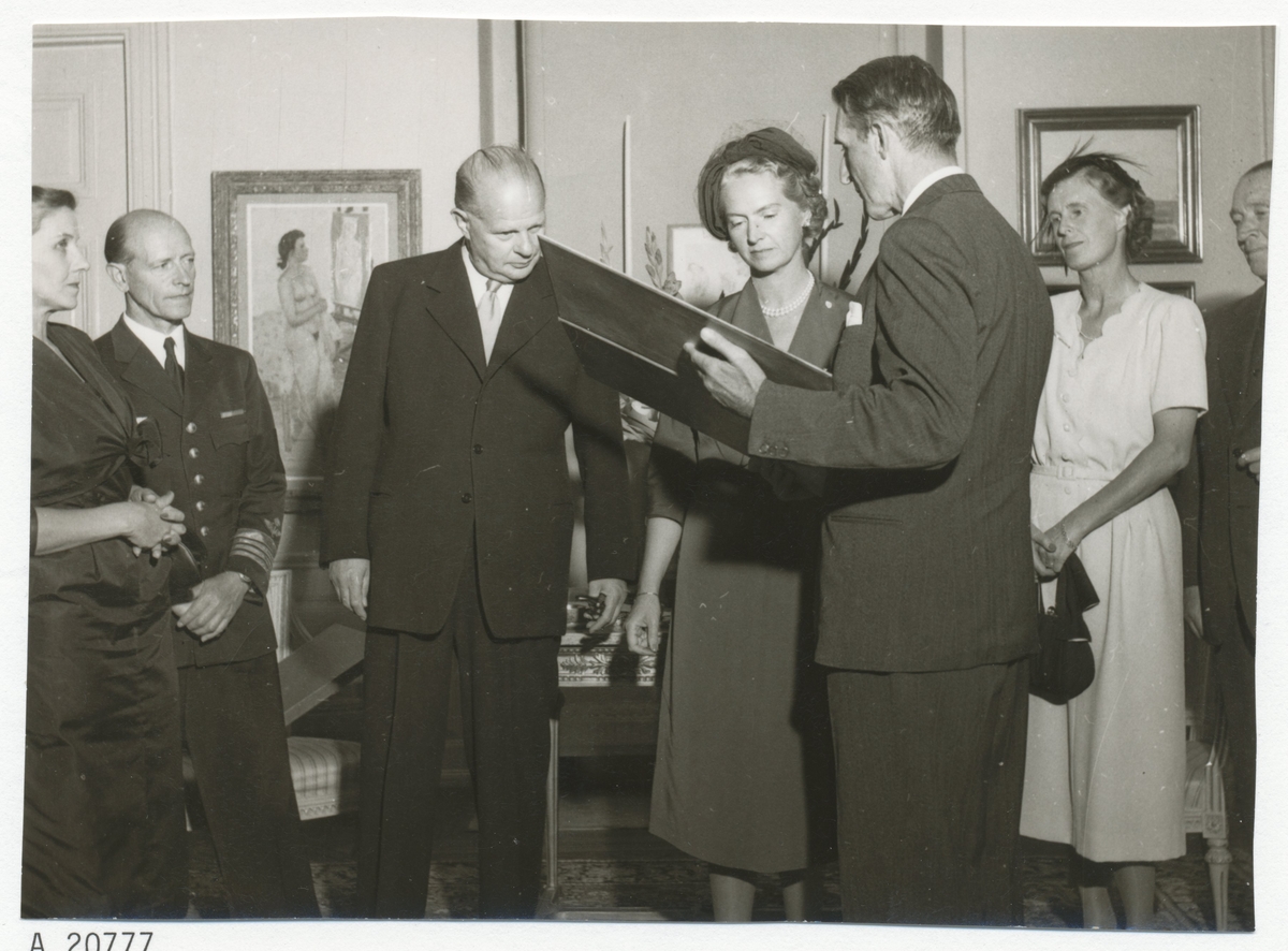 Människor i residenset med bland annat en överste. Landshövding Ruben Wagnsson och prinsessan Sibylla tittar i en gästbok i Kalmar.