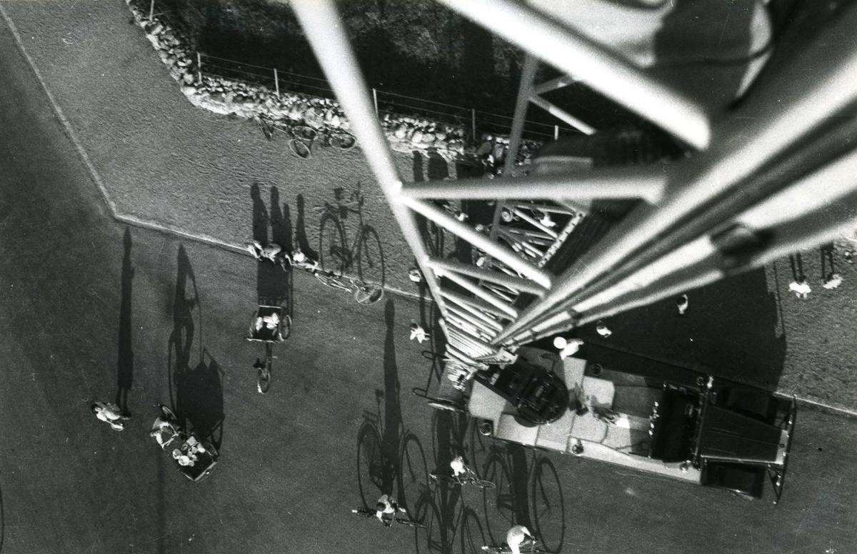 Uppvisning av Brandkåren. Utsikt uppifrån en maskinstege (en så kallad Magiriusstege) ner på gatan där det står publik.