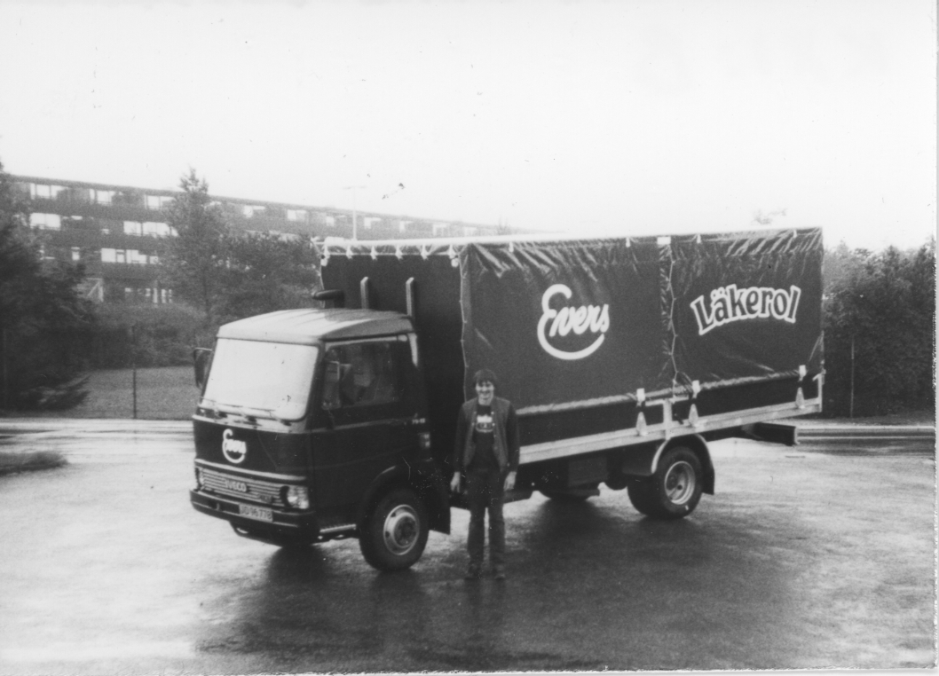 Lastbil med Läkerol och Evers reklam på kapellet.