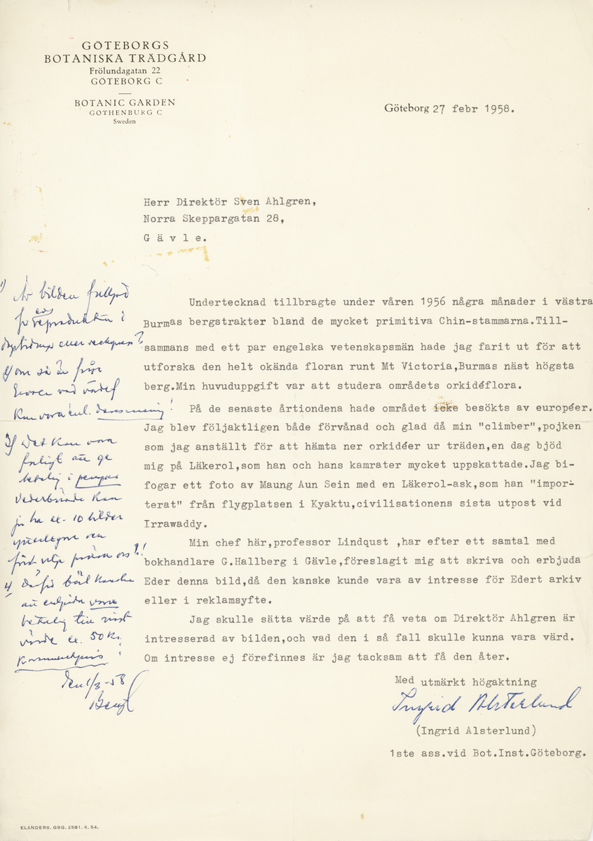 Brev till Sven Ahlgren 1951 samt tillhörande foto.