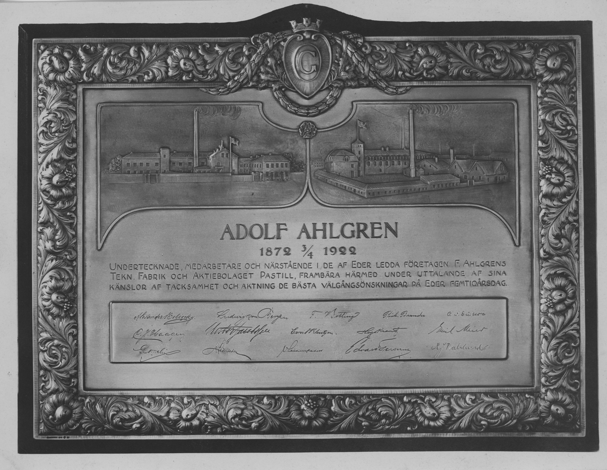 Text på plaketten: 1872 3/4 1922 Undertecknade, medarbetare och närstående i de af eder ledda företagen F. Ahlgrens Tekn. fabrik och Aktiebolaget Pastill, frambära härmed under uttalande af sinakänslor af tacksamhet och aktning de bästa välgångsönskningar på eder femtioårsdag.
