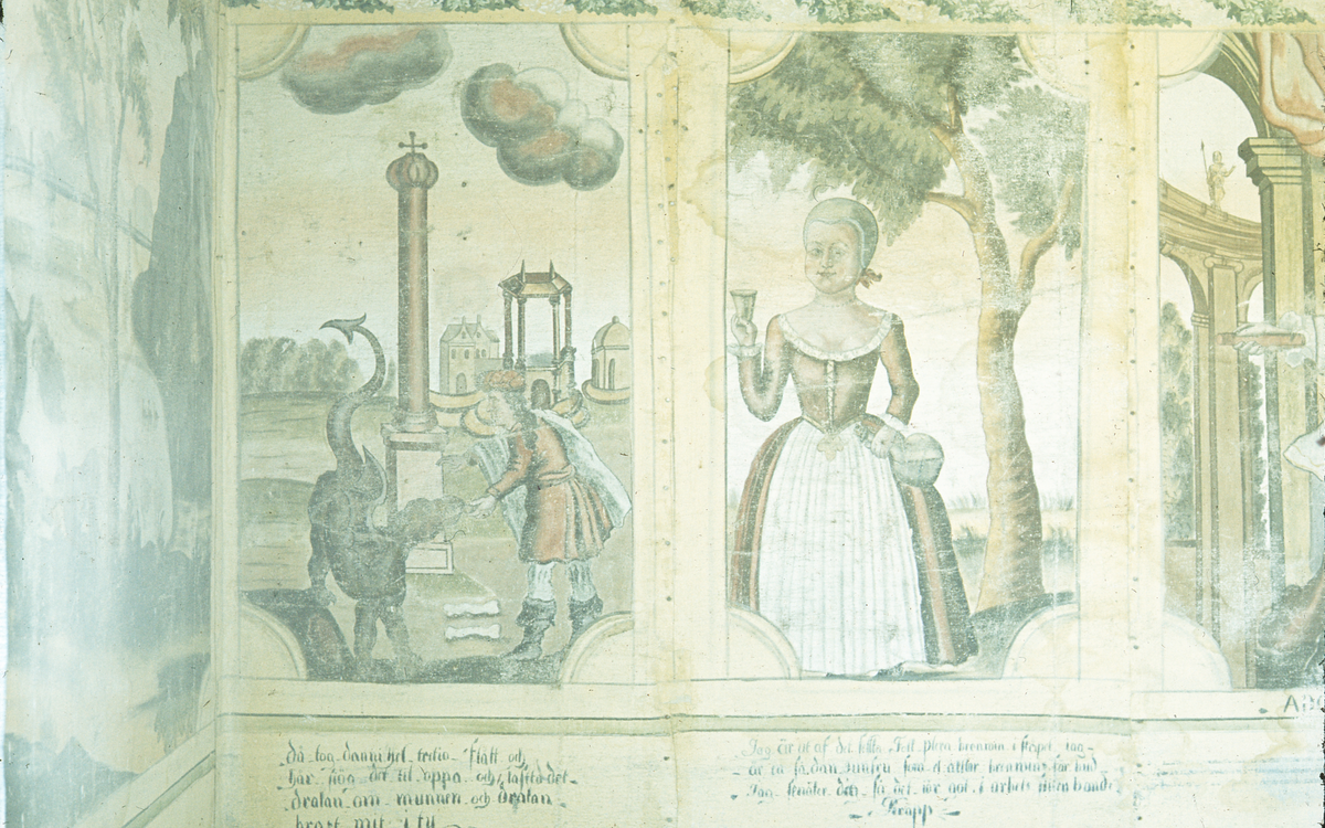 Väggmålning med bibliska motiv. T.v. Daniel och Draken.