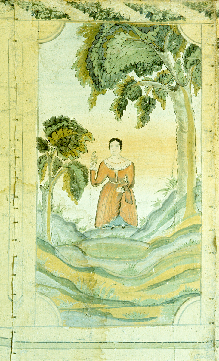 Väggmålning. Kvinna iförd klänning ute i naturen.