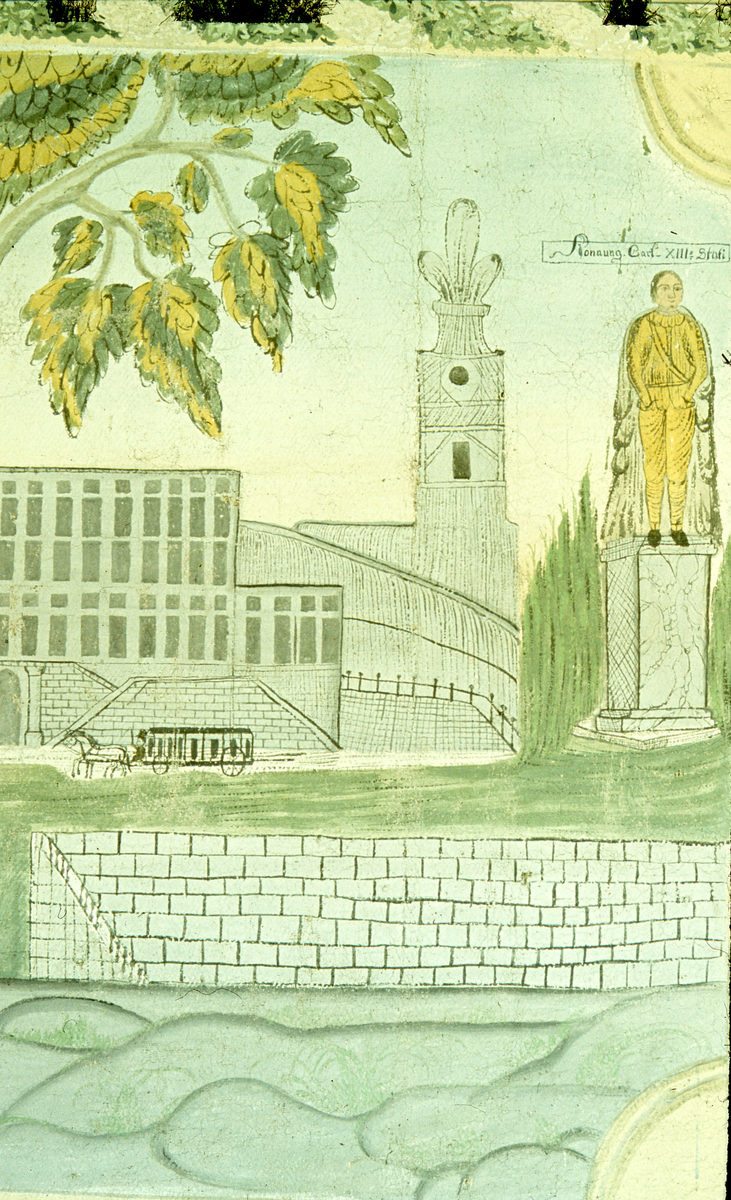 Del av väggmålning. Kungliga slottet i Stockholm. Staty till höger "Konung Carl XIII...."