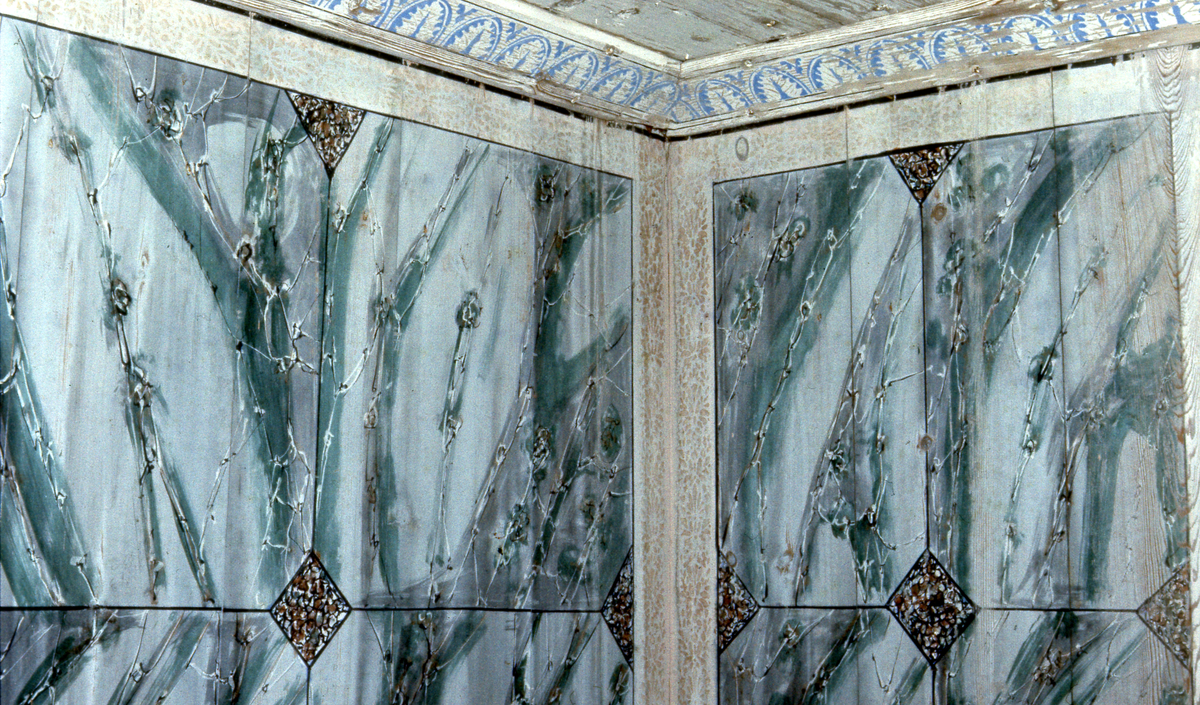 Väggmålning med marmoreringsmåleri. Dekormålad taklist.