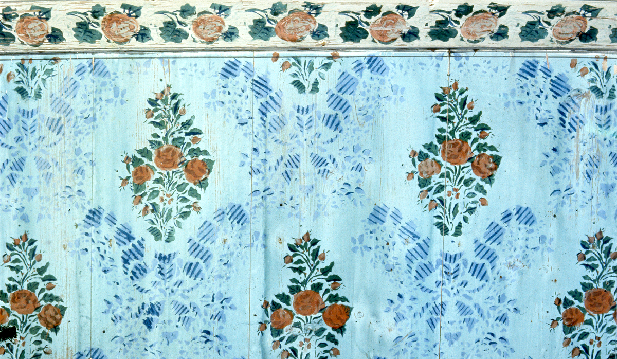 Väggmålning, rosbuketter. Dekormålad taklist.