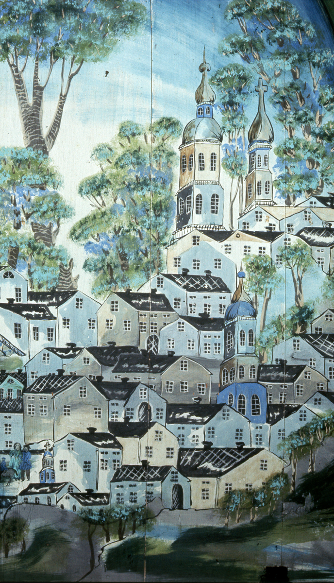 Detaljbild av väggmålning "Stockholm". Bostäder, kyrkotorn och träd i bild.