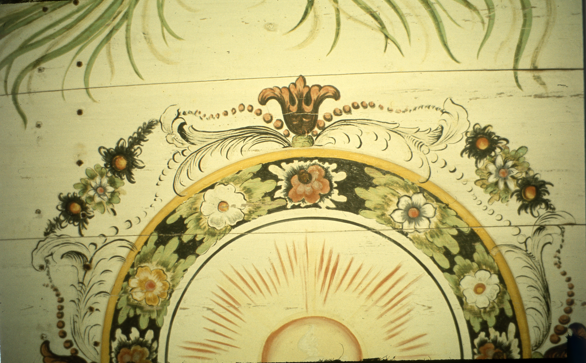 Del av takmålning. Sol i mitten och blomstermålningar i cirkel runtom.
