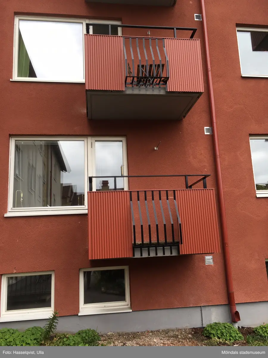 Husfasad med fönster och balkonger till bostadshus vid Hagåkersgatan i Bosgården, Mölndal, år 2019.