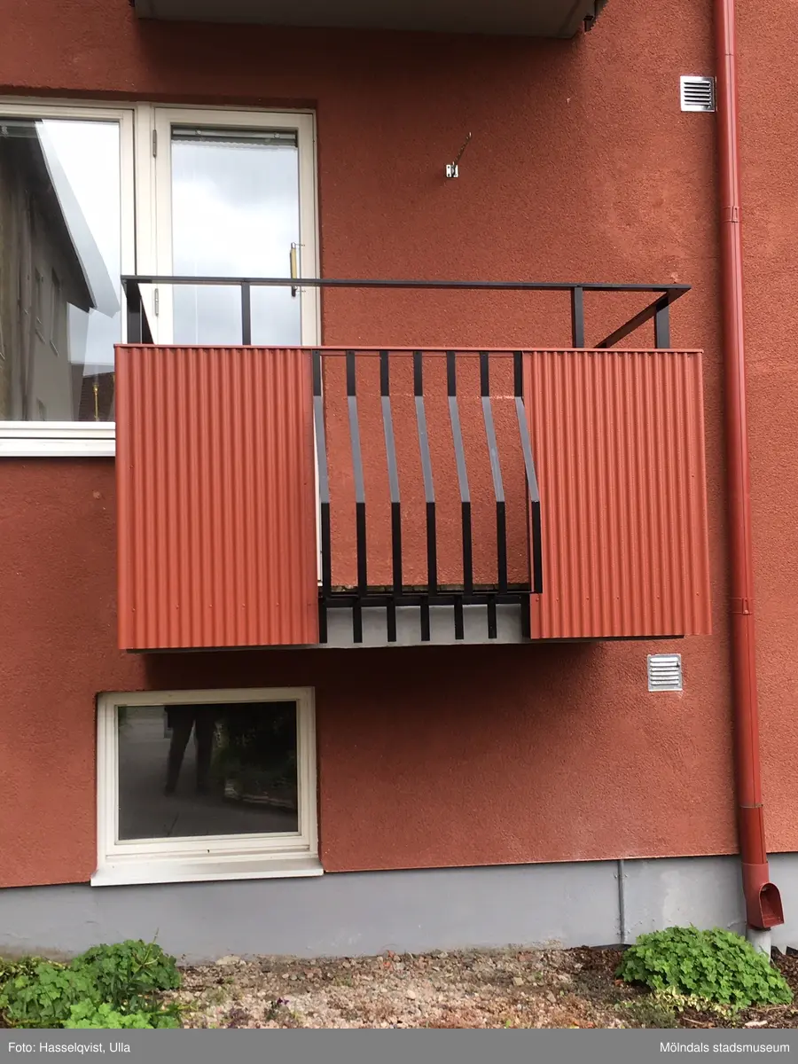 Husfasad med fönster och balkong till bostadshus vid Hagåkersgatan i Bosgården, Mölndal, år 2019.