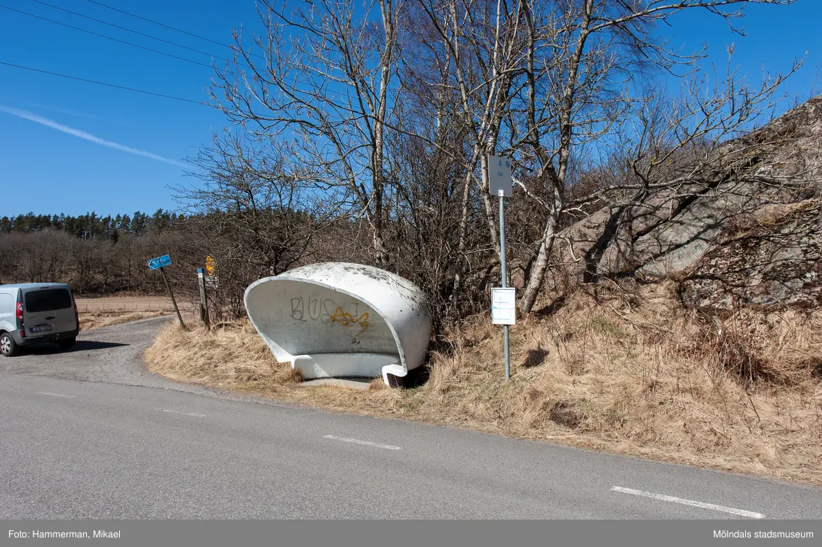 Norra Hällesåkersvägen i Lindome, Mölndals kommun, i april 2013. Busskuren vid busshållplatsen Skår.