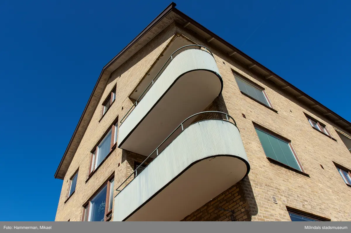 Husfasad med fönster och balkonger på bostadshus i Bosgården, Mölndal, april 2013.