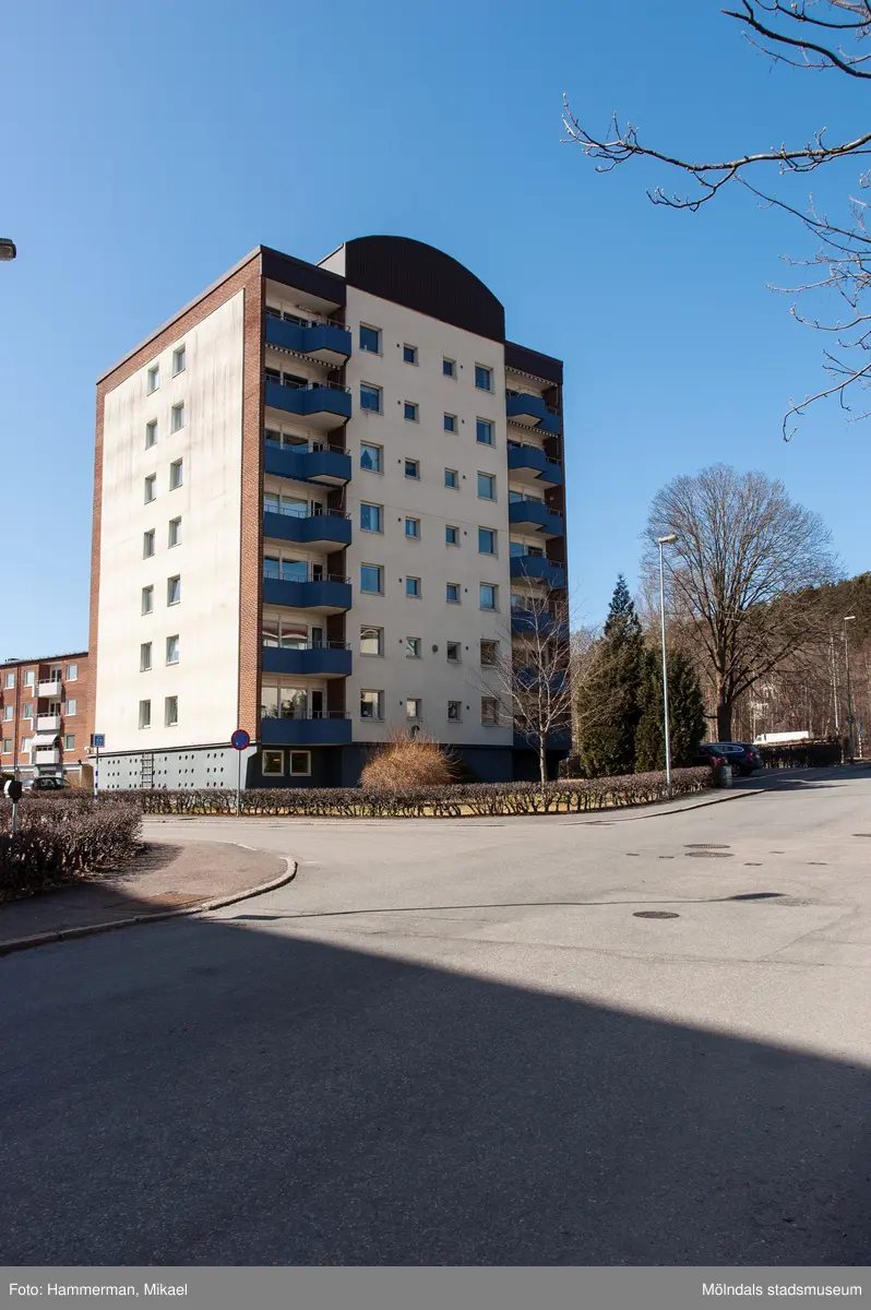 Bostadshuset Hagåkersgatan 22 i Bosgården, Mölndal, april 2013. Vy från Häradsgatan.