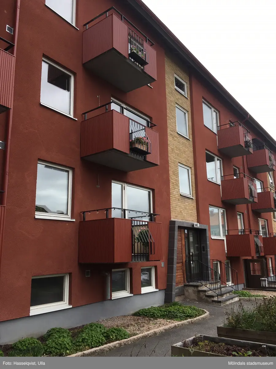 Husfasad med balkonger och port till bostadshuset med adressen Hagåkersgatan 14C i Bosgården, Mölndal, år 2019.