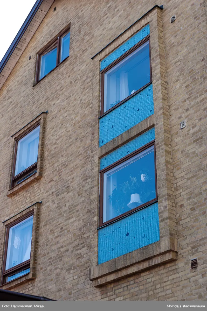 Gavel med fönster till bostadshuset Hagåkersgatan 7 i Bosgården, Mölndal, april 2013. Ett par fönster är utsmyckade med mosaiker.