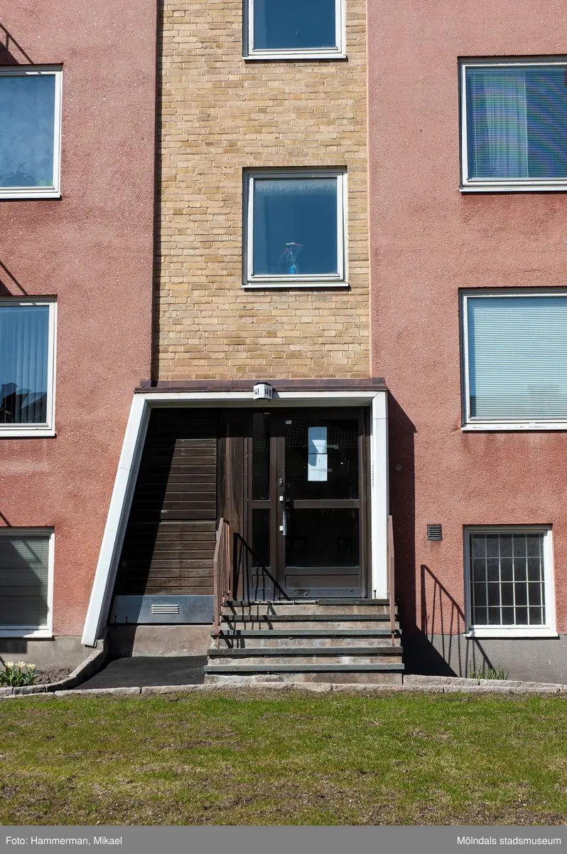 Fasad med port och fönster till bostadshuset Hagåkersgatan 14B i Bosgården, Mölndal, april 2013.