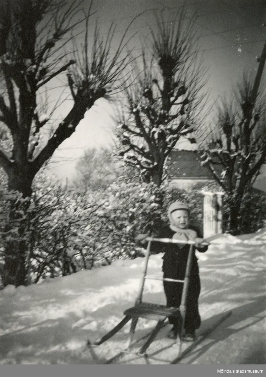 Vinter i Lackarebäck, Mölndal, på 1950-talet. Jan Erik Wäne åker sparkstötting i snön.