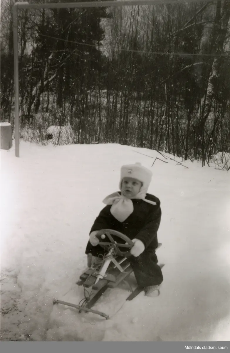 Vinter i Lackarebäck, Mölndal, på 1950-talet. Jan Erik Wäne sitter på sin kälke i snön.