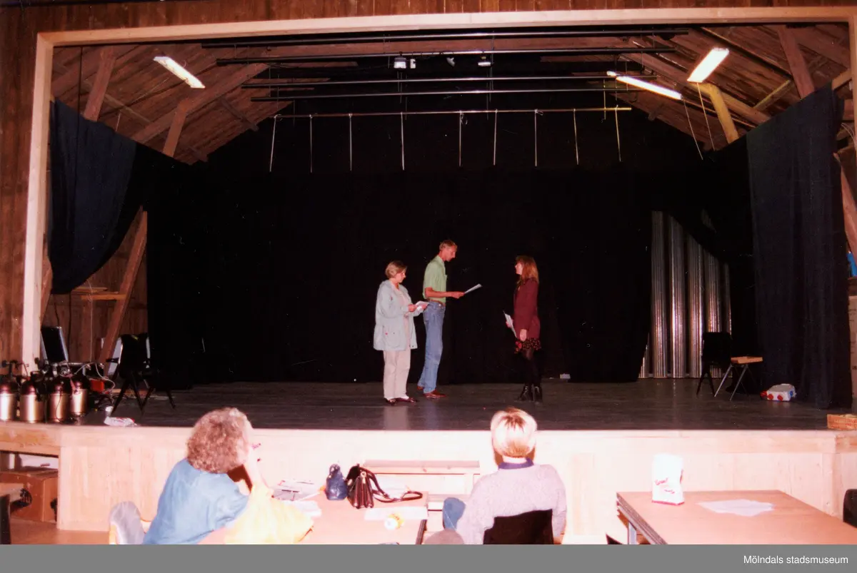 Tre personer står på scenen och repeterar i Teaterhuset, okänt årtal. Två personer sitter nedanför scenen och tittar på.