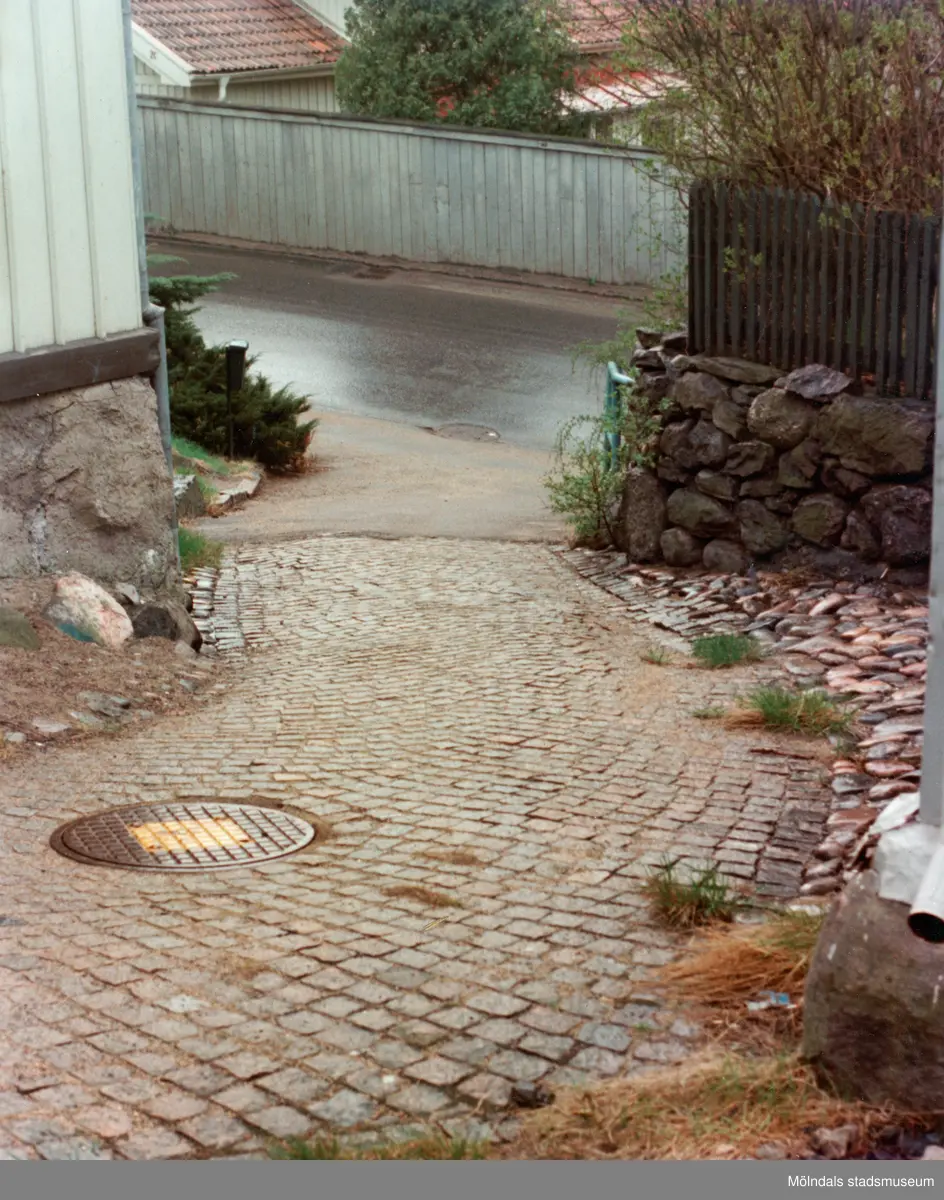 Nedersta delen av Stalleliden i Mölndals Kvarnby, omkring 1975-1980. Bakom planket ses liten del av läkarbostaden, Forsåkersgatan 2C. där dr Belfrage en gång bodde.