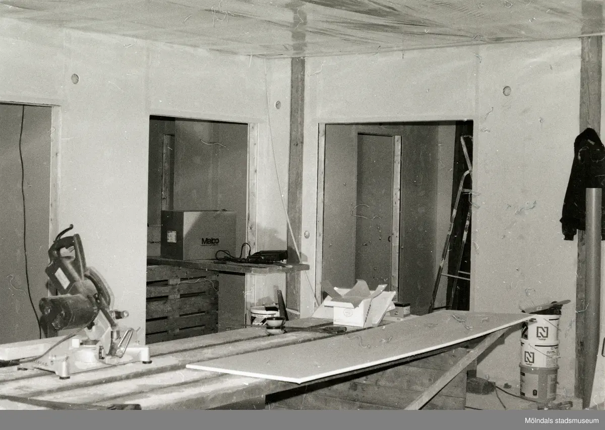 Nya Teaterhuset byggs upp 1997 - 1998. Bild inomhus i ett rum där man kan se en uppbyggd arbetsbänk. På arbetsbänken ligger en stor träskiva och sågade småplankor.