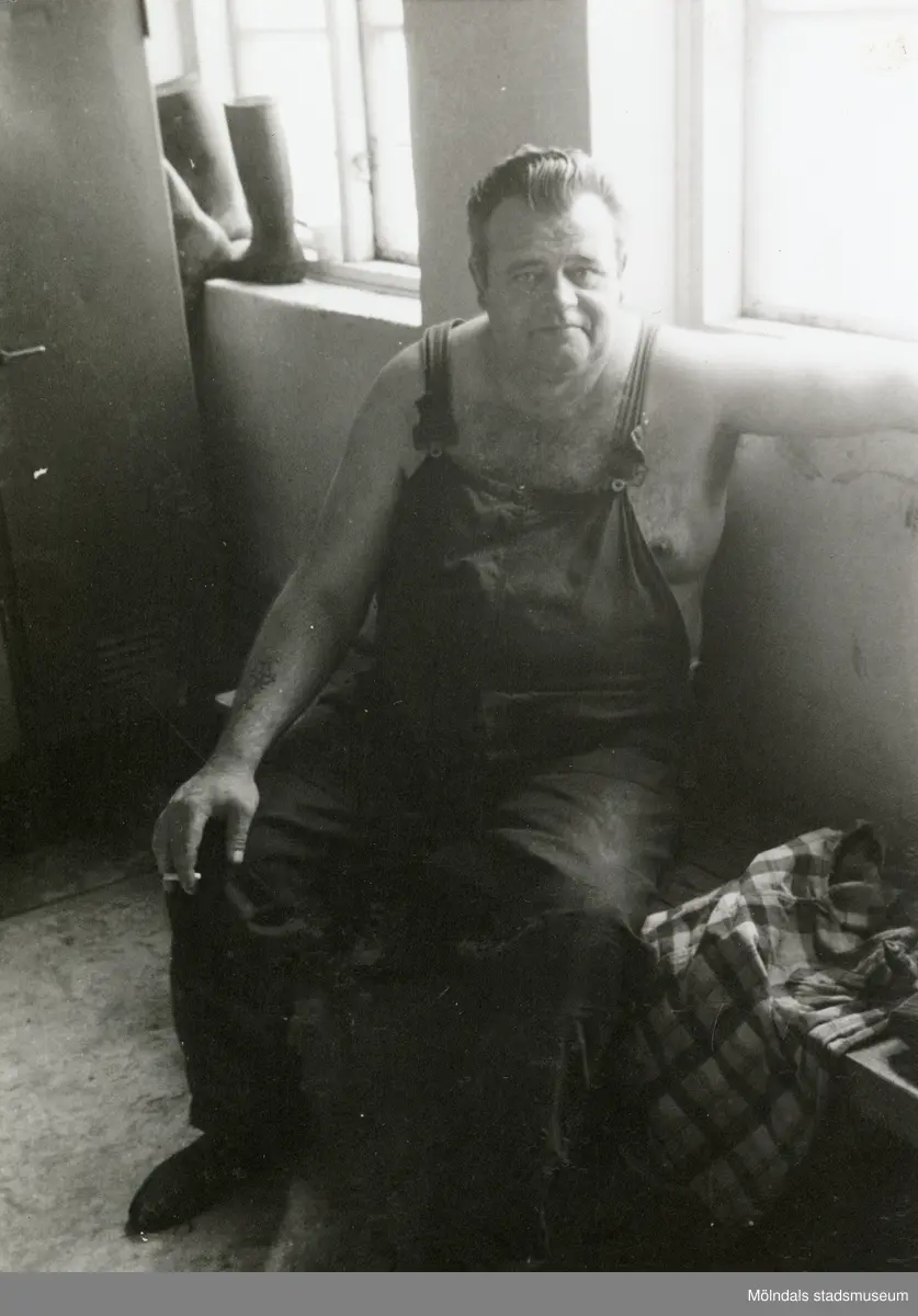 Porträtt av Wickelgren i omklädningsrummet på Göteborgs Jästfabrik i Krokslätt, Mölndal, år 1972.