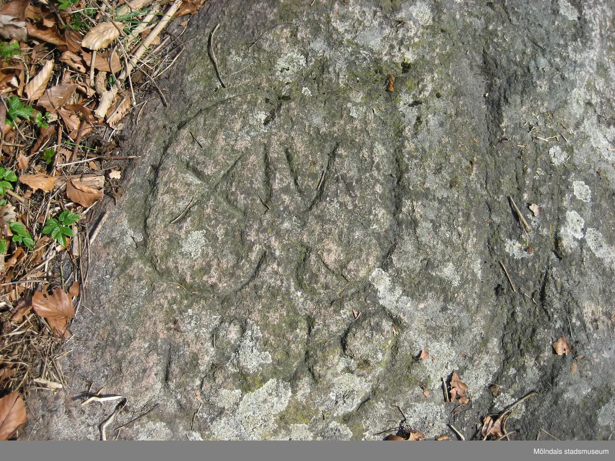 Titel: Kungsstenen vid Stensjön i Mölndal den 16 april 2008. Den så kallade Kungsstenen har inskriptionen C XIV J 1819 (Carl XIV Johan). Detta var den fasta utgångspunkten för uppmätning av Mölndalsfallen år 1819 då kvarnfallens olika fallhöjd och gränser bestämdes. Enligt uppgift skall man även ha använt Kungsstenen som vattenmärke. Stensjöns vatten fick inte dämmas upp så att det steg över Kungsstenen.