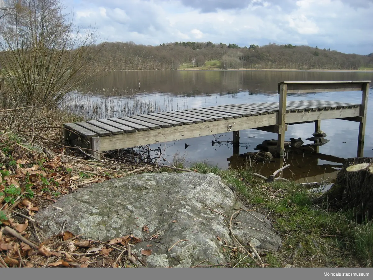 Titel: Kungsstenen vid Stensjön i Mölndal den 16 april 2008. Den så kallade Kungsstenen har inskriptionen C XIV J 1819 (Carl XIV Johan). Detta var den fasta utgångspunkten för uppmätning av Mölndalsfallen år 1819 då kvarnfallens olika fallhöjd och gränser bestämdes. Enligt uppgift skall man även ha använt Kungsstenen som vattenmärke. Stensjöns vatten fick inte dämmas upp så att det steg över Kungsstenen.