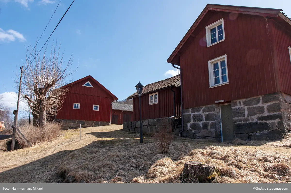 Ladugård samt andra ekonomibyggnader på hembygdsgården Börjesgården i Lindome, Mölndals kommun, i april 2013.