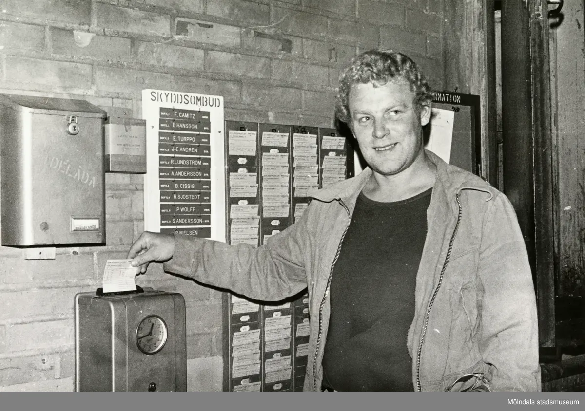En man stämplar in/ut vid en stämpelklocka på fabriken Soab Berol Kemi i Mölndals Kvarnby, år 1977.