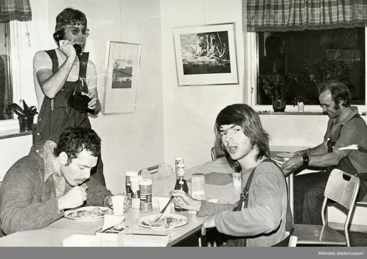 Fyra män i lunchrummet på fabriken Soab Berol Kemi i Mölndals Kvarnby, år 1977.