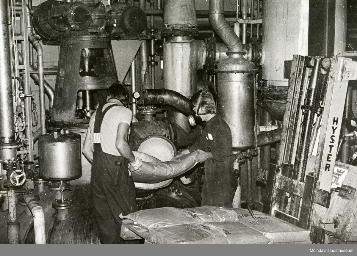 Två män i arbete på fabriken Soab Berol Kemi i Mölndals Kvarnby, år 1977.